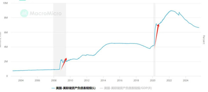类似的道理,在上面提到的两次大的政策刺激中,降息只是一系列政策组合拳中间的一个环节而已。真正起决定性作用的是美联储资产规模的扩张,也就是扩表。如下图所示,这两次危机中,出现了非常明显的扩张。